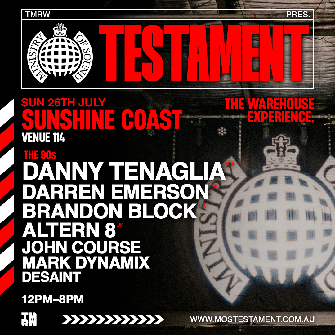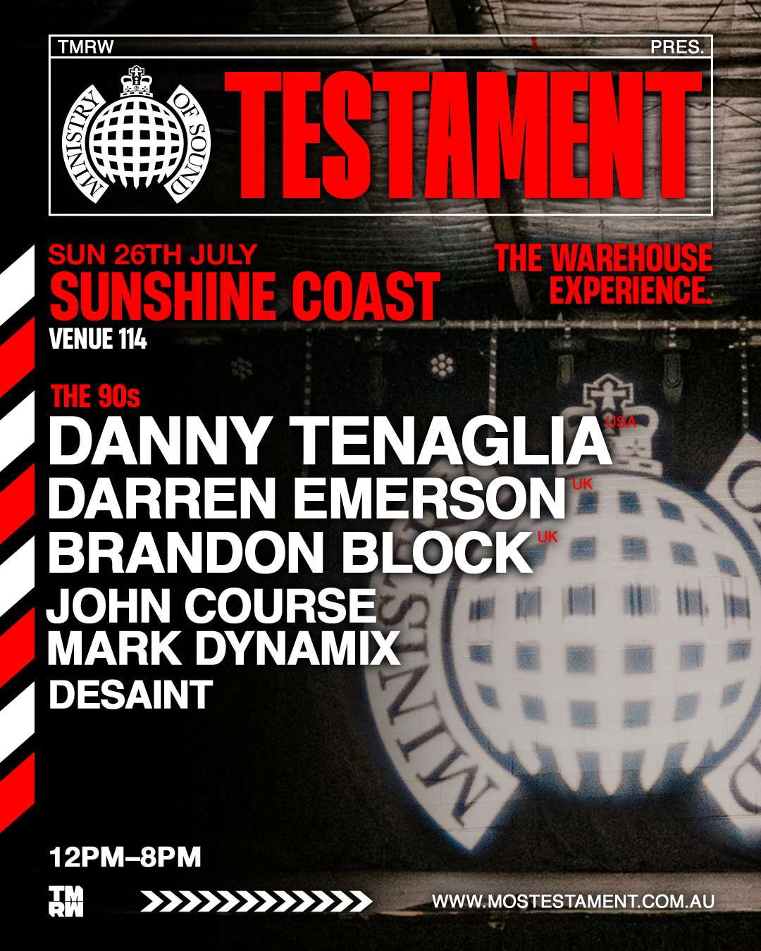 Ministry of Sound Testament is back in July 2026 with our most highly-anticipated tour to date. The warehouse experience is primed to take over a new dancefloor on the Sunshine Coast, at waterfront space Venue 114, for a one-off Testament to 90s club culture.