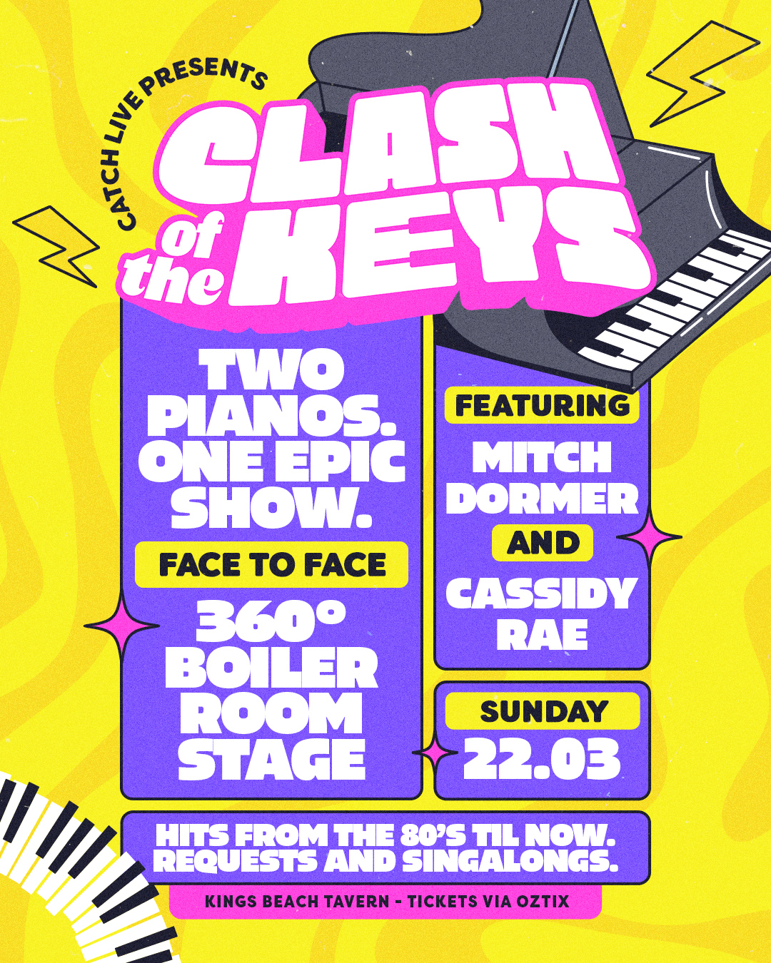 Sunday sessions donβt get bigger than this. Clash of the Keys brings a 360-style duelling piano show to Kings Beach, with Mitch Dormer and Cassidy Rae delivering nonstop crowd-driven chaos in the best way possible πΉβ‘ Expect requests flying in, playful rivalry at the pianos and massive singalongs that pull everyone into the show π€π₯ From timeless classics to modern favourites, every song is fair game and the energy never dips. Come for a session, stay for the party ππ»