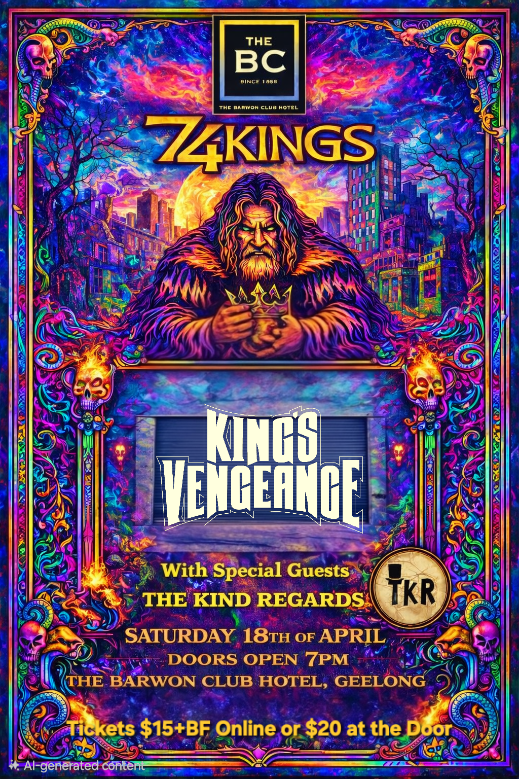 Thundering into the Barwon Club Hotel on Saturday 18 April, 2026 is a direct hit of Old School Heavy Rock built for a packed Saturday Night bandroom featuring three top-notch Victorian bands 74 KINGS, joined by Kings Vengeance + special guests The Kind Regards.