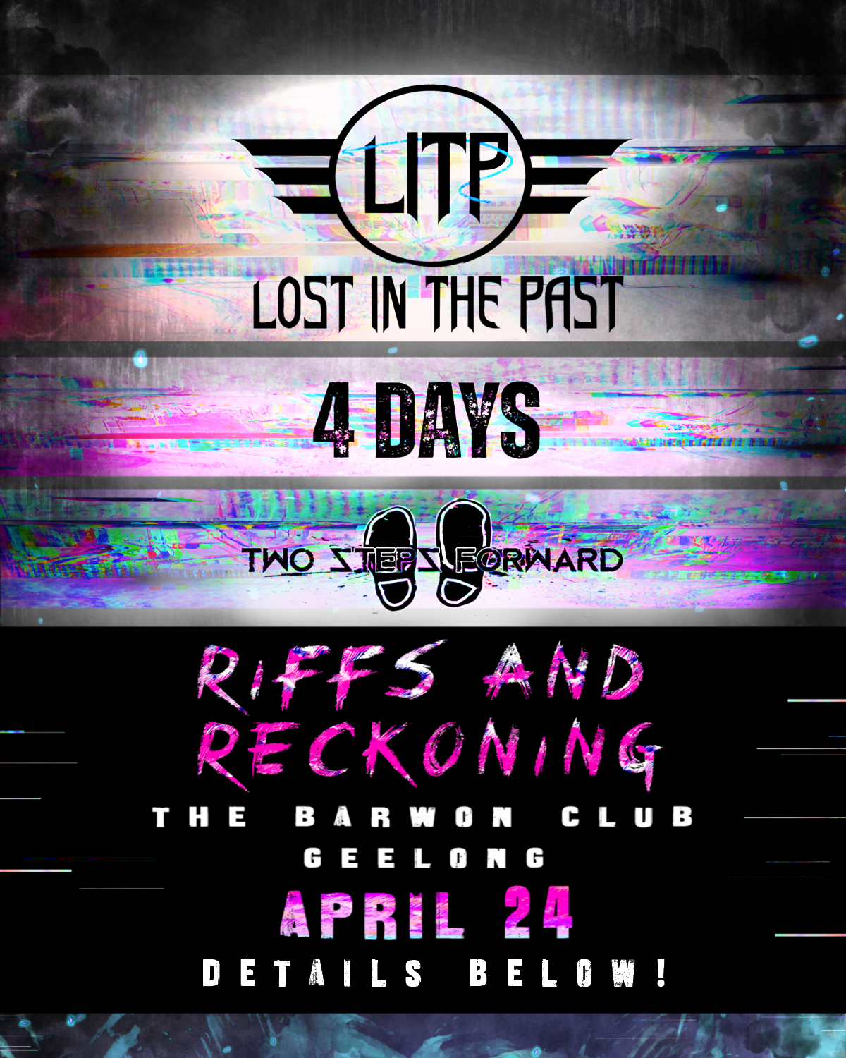 Bendigo's finest blaze into the BC for a Co-headline tour with Lost In The Past / 4 Days with special guests Two Steps Forward on Friday 24th April, 2026 for a Night of Heavy Rock & Metal Night, 3 bands, 1 Night. No Mercy
